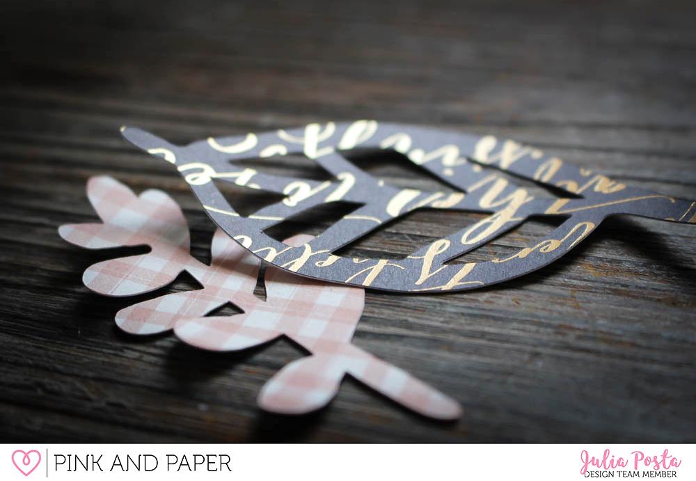 Az első projektem egy szülinapi csomagolás, ami a lányom barátnőjének szülinapi ajándékát rejti. A selyempapírt a Pebbles Heat of Home kivágataival és az előre kivágott levelekkel díszítettem.