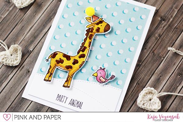 I flipped through the paper pack and I fell in love with this blue paper with white dots, so I knew in a moment that I want to use it as my background. I trimmed it down to be slightly smaller than my card base to make my layout a bit more interesting. Next, I used some white paper that is also included in the kit, to make two snowy hills. I can’t really make a card without a sentiment, so I just stamped ‘party animals’ at the bottom of one of the hills and I love the result.